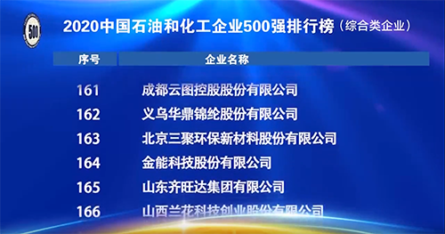 近日,2020中國(guó)石油和化工企業(yè)500強(qiáng)發(fā)布會(huì)暨后疫情時(shí)代化工大企業(yè)發(fā)展高峰論壇于線(xiàn)上召開(kāi)。會(huì)上發(fā)布了2020中國(guó)石油和化工企業(yè)500強(qiáng)排行榜、分行業(yè)百?gòu)?qiáng)企業(yè)排行榜及2020年中國(guó)石油和化工行業(yè)發(fā)展指數(shù)。北京三聚環(huán)保新材料股份有限公司入選綜合類(lèi)企業(yè)500強(qiáng),位列第163位。