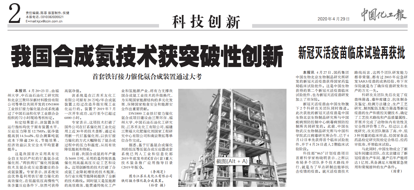 4月29日《科技日報》發(fā)表了記者馬愛平《我國首套“鐵釕接力催化”氨合成工業(yè)裝置通過大考》的報道。